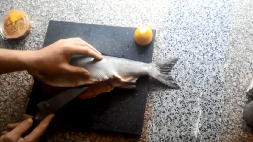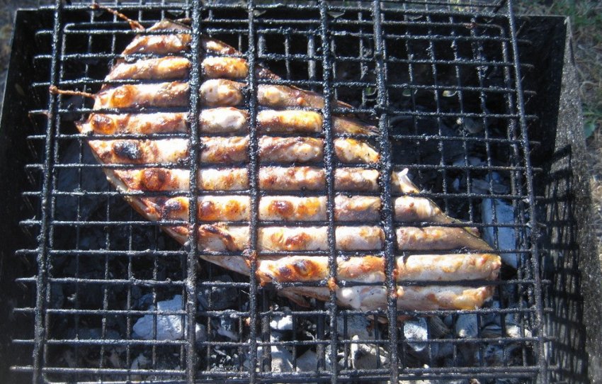 із розпалювання багаття, щоб до моменту готовності горбуші вугілля вже прогоріло. Рибу потрібно очистити від луски, видалити нутрощі, відрізати голову і плавники. Розрізати її на 2 частини по всій довжині і добре полити соком половинки лимона.![]()
