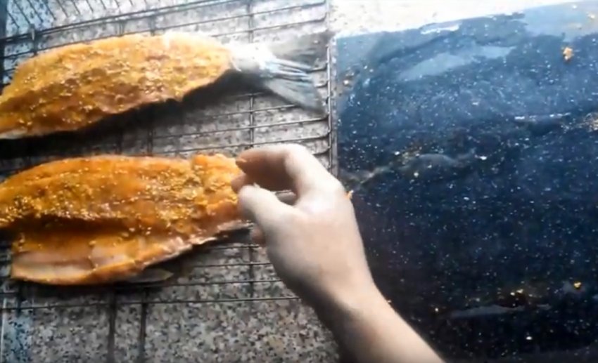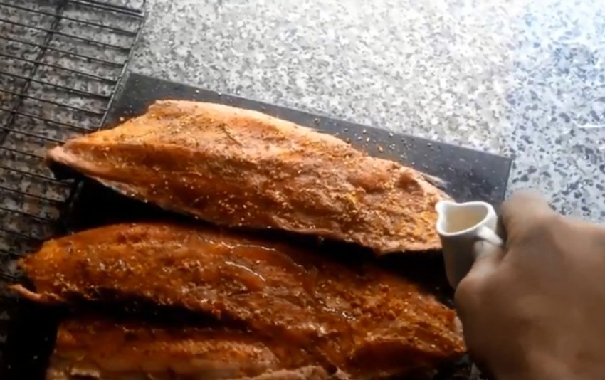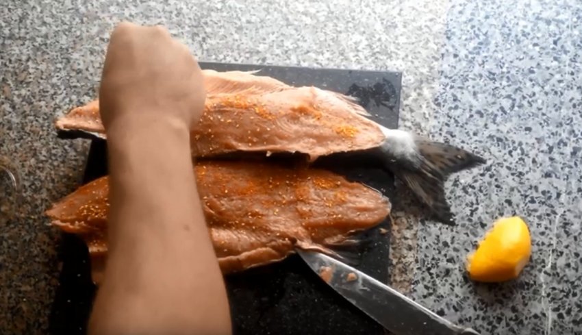 Обсипати спеціями, посолити, поперчити і залишити на 20 хвилин, щоб рибні половинки набули смаку і просочилися маринадом.![]()