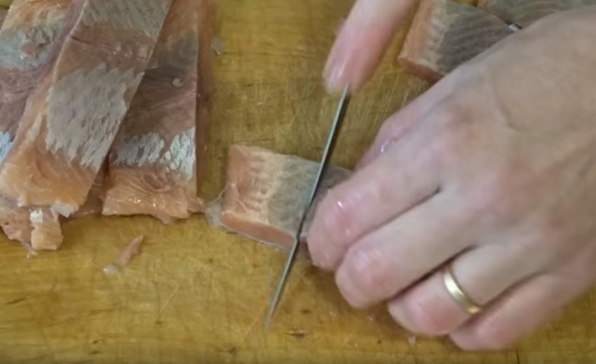 Якщо придбано цілу рибину, то починати готувати її потрібно з очищення луски і патрання. Якщо ж ідеться про філе або готові стейки, то цей пункт не потрібен.Зробіть акуратні надрізи біля хвоста і голови, щоб зняти шкіру. Піддягніть її гострим ножем біля хвоста, і вона легко скачається в рулон.Тепер наріжте філе на порційні шматки.![]()