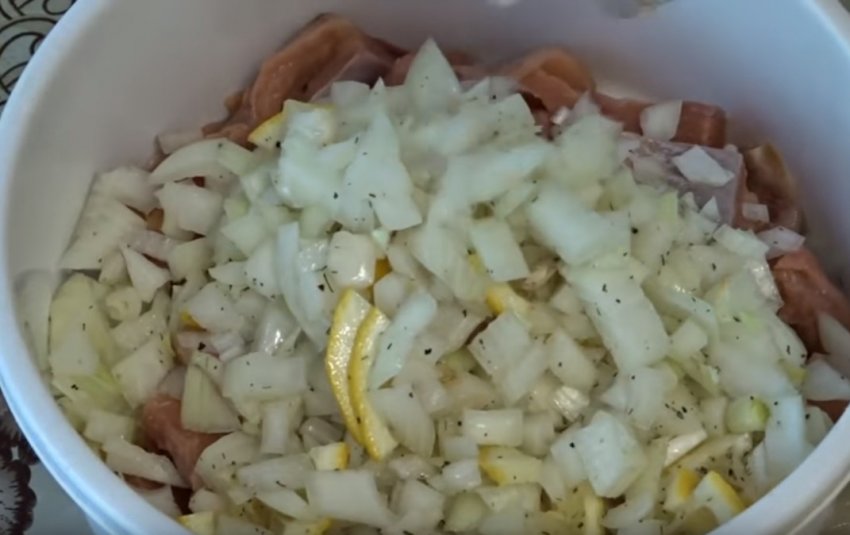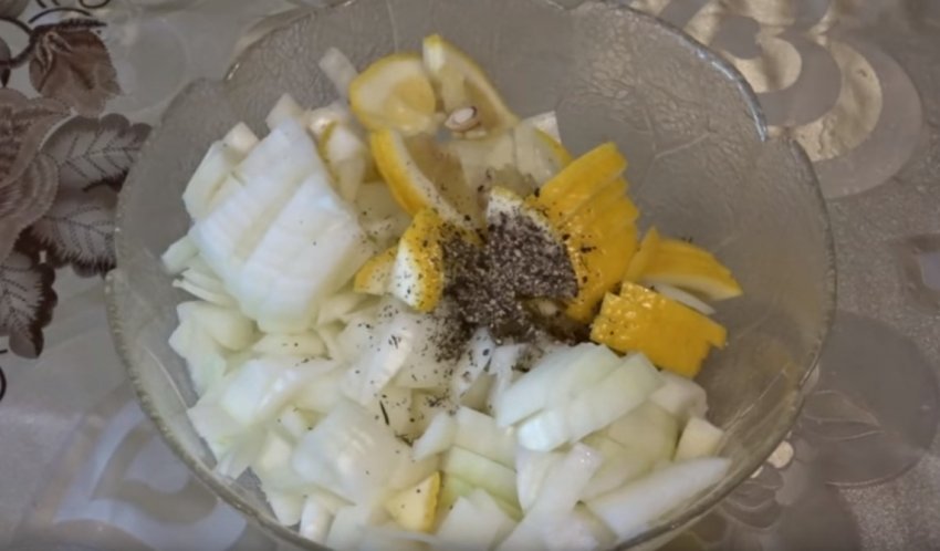 маринаду необхідно порізати половину очищеної цибулі кубиком, а другу - кільцями, а також розрізати половинку лимона на часточки. Викладіть кубики цибулі та лимон у миску. Посипте сіллю, чорним перцем, сушеними травами. Потім додайте до них оцет і перемішайте.![]()