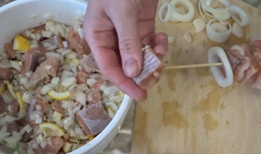 Нанизуйте на шпажки шматочки філе, чергуючи їх із кільцями цибулі.![]()