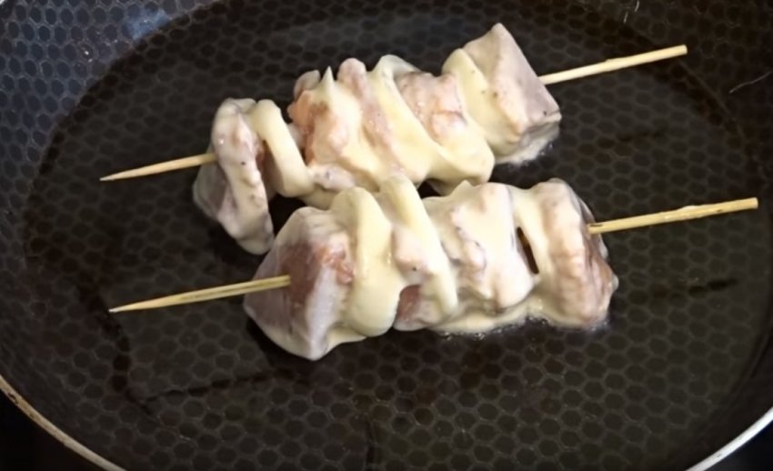 Поставте на вогонь сковорідку і розігрійте в ній олію. Шашлички перед зануренням в олію вмочіть у кляр. Їх необхідно обсмажити з усіх боків по 4 хвилини.![]()