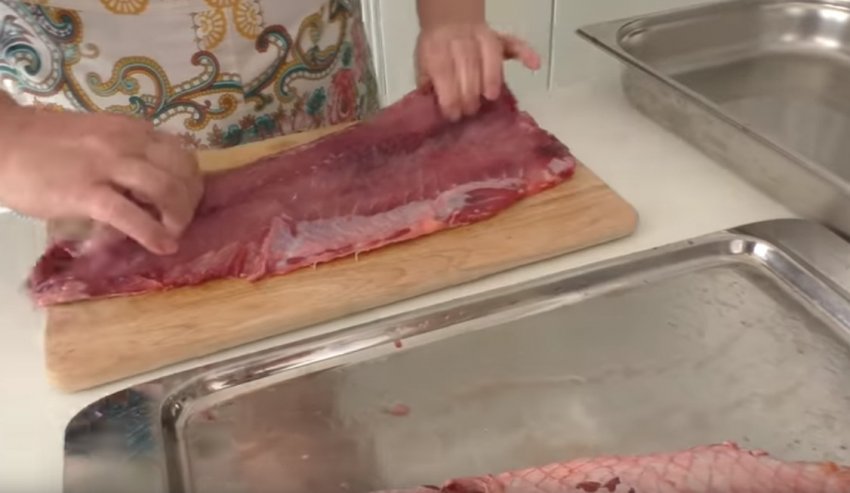 Розділити рибу на дві частини, розрізавши тушку вздовж хребта. Кістки хребта видалити. Кожну частину посипати сіллю і цукром, розтерти і залишити просолюватися на 3 години. Сіль дасть змогу позбутися зайвої рідини, а цукор додасть м'ясу солодкуватого смаку.![]()