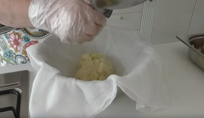 Марлю з цибулевою масою зібрати в мішечок і процідити сік у м'ясо. Маринувати протягом двох годин.![]()