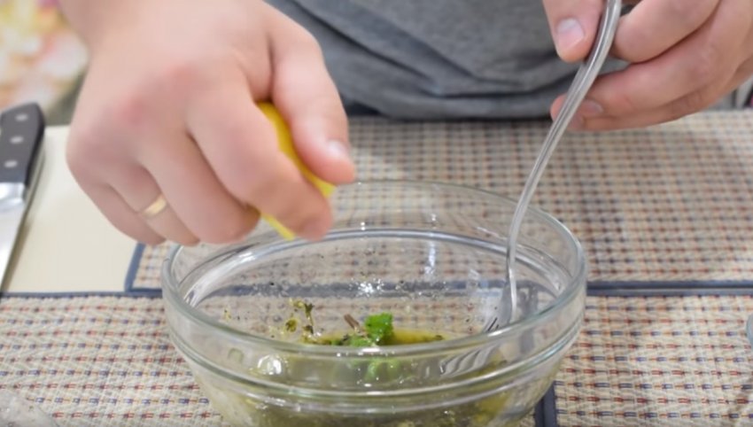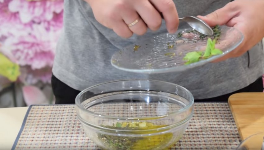 Зробити маринад. Для цього потрібно вилити в ємність оливкову олію, додати 2 ч. л. солі і висипати подрібнені спеції (мелений перець, лемонграс, м'ята і чебрець). Потім натерти на тертку цедру лимона. При цьому натирати слід лише жовту частину шкірки, біла для готування не знадобиться.![]()