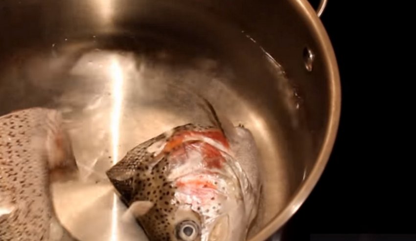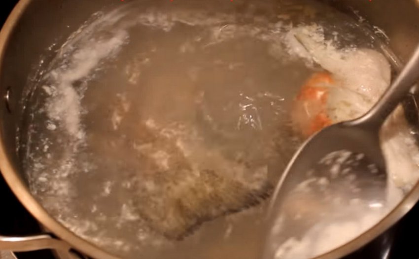 У каструлю налити води і помістити туди голову і хвіст риби, залишити варитися на 30 хвилин на слабкому вогні.![]()