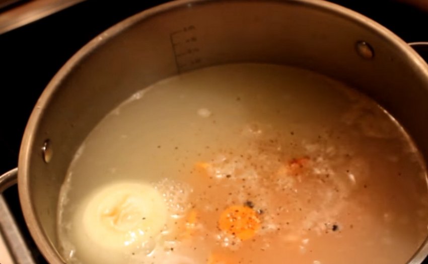 Промити пшоно, помістити його в бульйон. Потім додати моркву, цибулю, мелений і горошком чорний перець.![]()