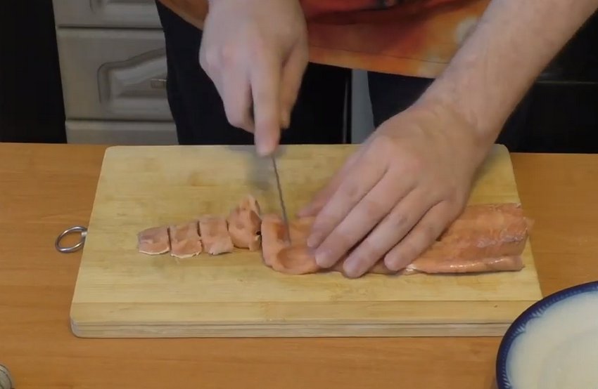 - Філе горбуші розрізати на шматки, посолити і додати спеції за смаком.