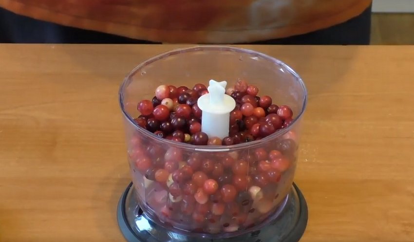 готувати заправку. Для цього в блендері подрібнити до стану однорідної маси такі інгредієнти: брусницю, кунжут, сіль, цукрову пудру, перець чилі.![]()