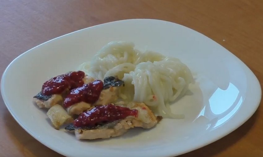 страву до столу в такому вигляді: поруч викласти шматки смаженого рибного філе та спагеті, зверху заправити соусом.![]()