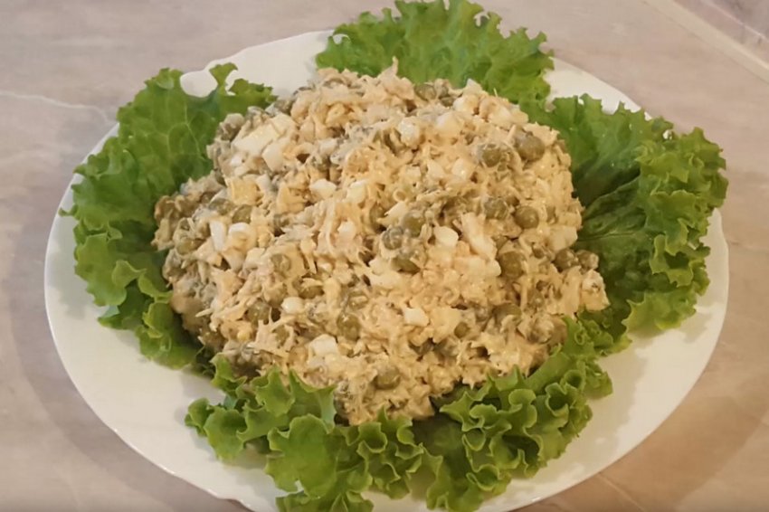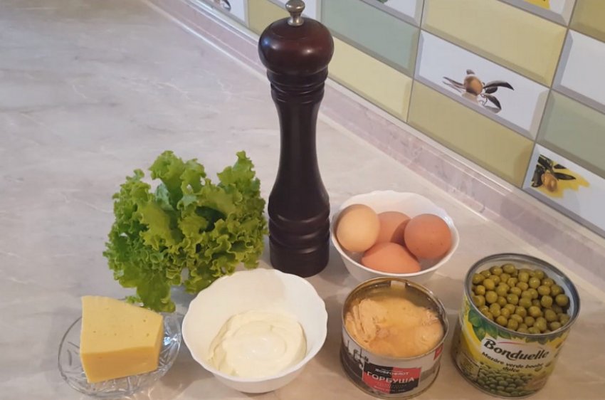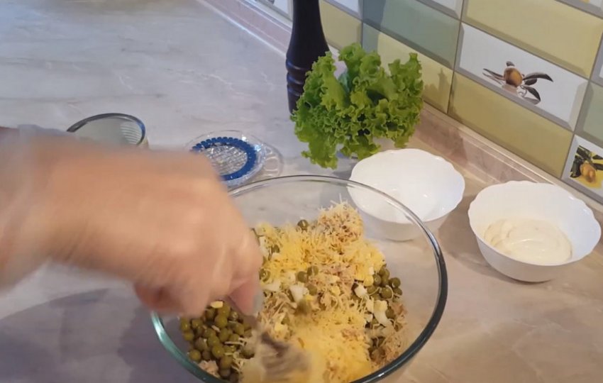 Змішайте з підготовленими інгредієнтами консервований горошок і майонез, додайте перець і сіль.![]()