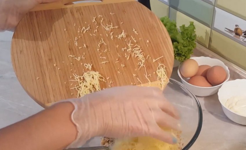 - Сир подрібніть, використовуючи тертку середнього розміру, перекладіть у миску і накрийте харчовою плівкою, щоб не обвітрився.