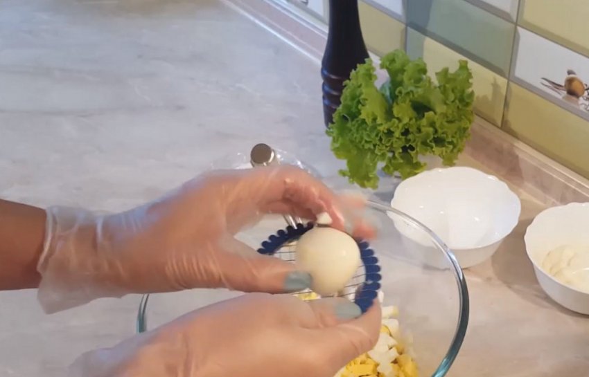 Займіться приготуванням яєць: у глибоку посудину, заповнену холодною водою, викладіть чисті яйця, зачекайте, поки закиплять, і відрахуйте 10 хв., остудіть. Звільніть від шкаралупи і натріть, використовуючи середню за розмірами тертку.![]()