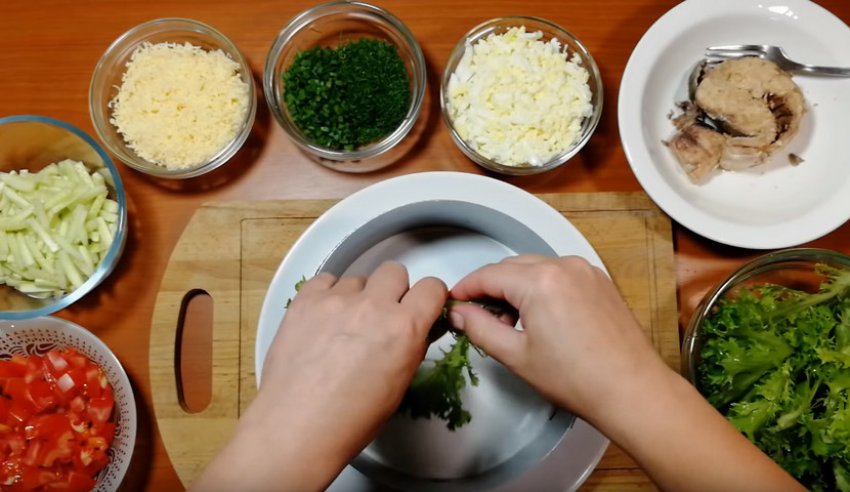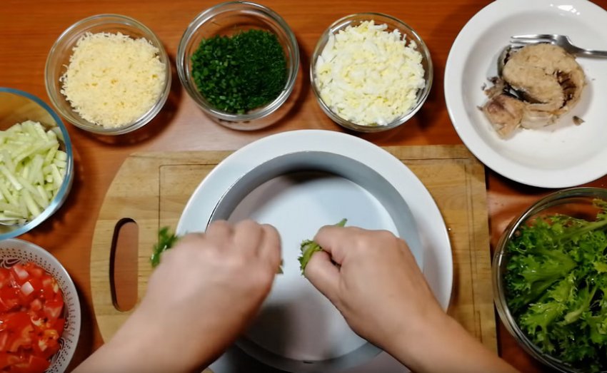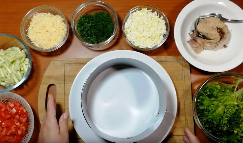 Приступайте до складання салату: візьміть велике кулінарне кільце, діаметром 15-18 см, встановіть його на блюдо. Якщо кільця немає, можна просто акуратно викладати інгредієнти шарами, намагаючись дотримуватися форми кола.![]()