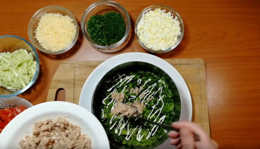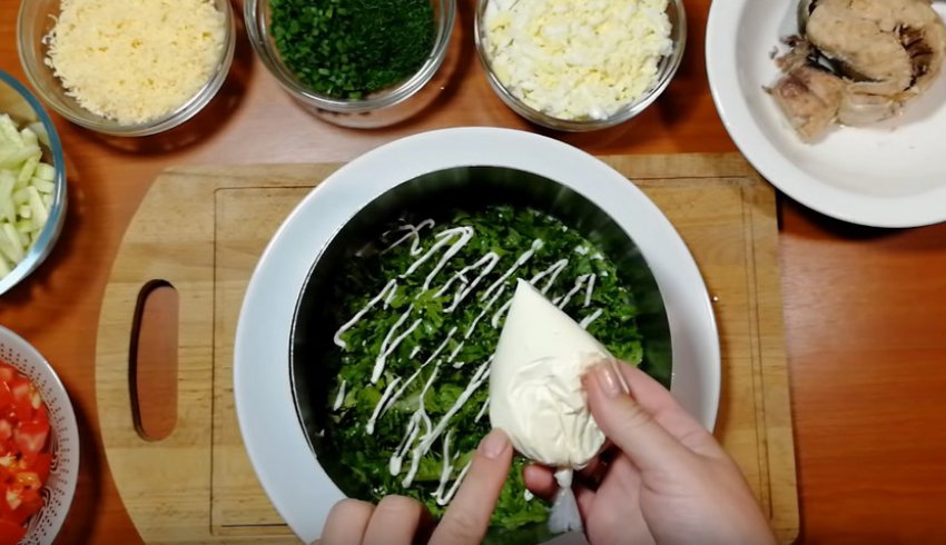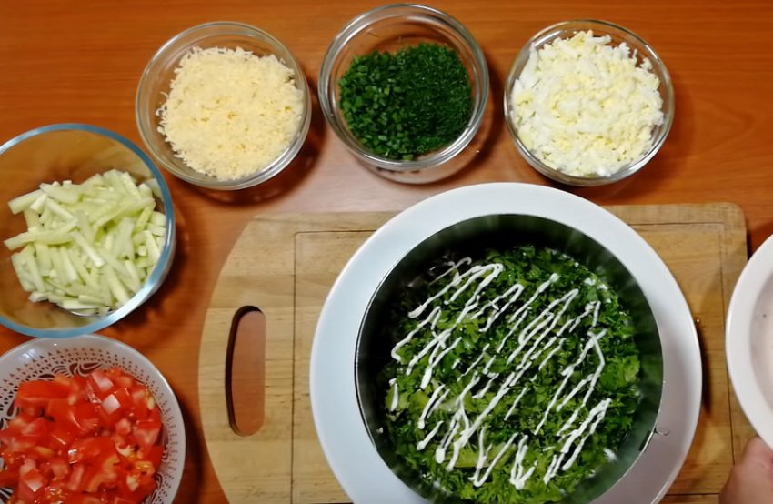 На дно викладіть подрібнений салат і полийте його майонезом. Щоб зручніше було працювати з майонезом, рекомендується купувати продукт у пачках, де можна зробити невеликий отвір і поливати шари зверху тонкою цівкою, яку залишити не розмазаною.![]()