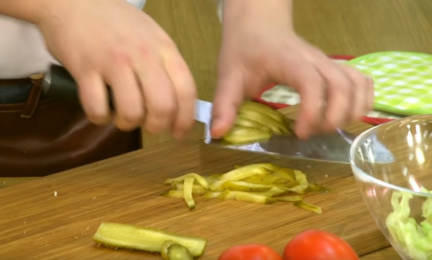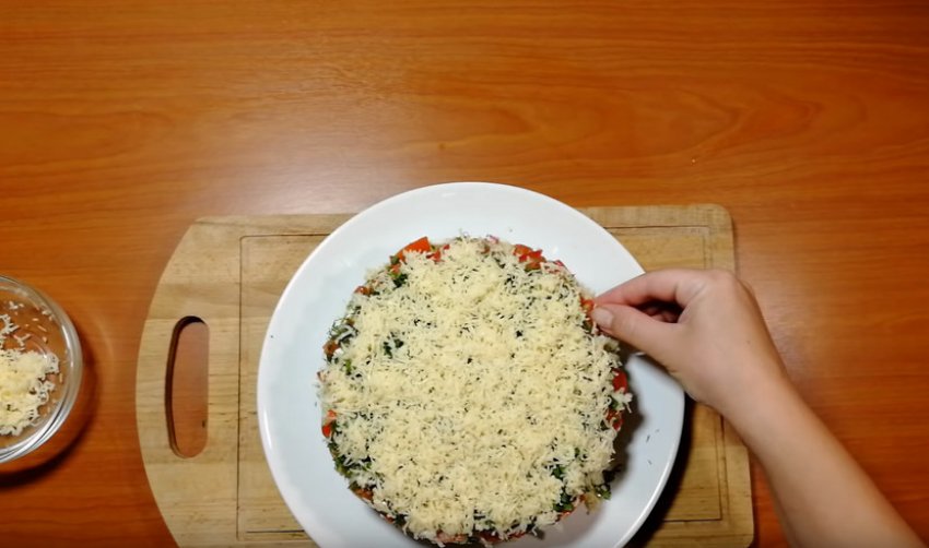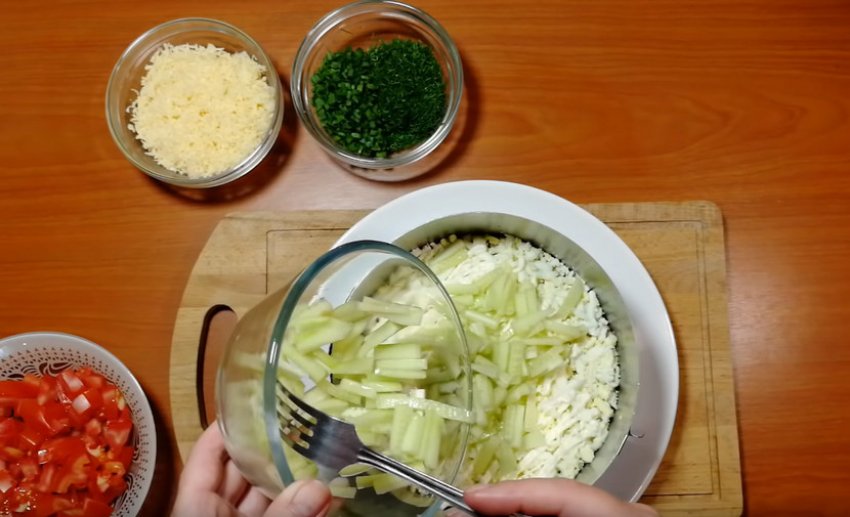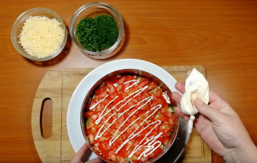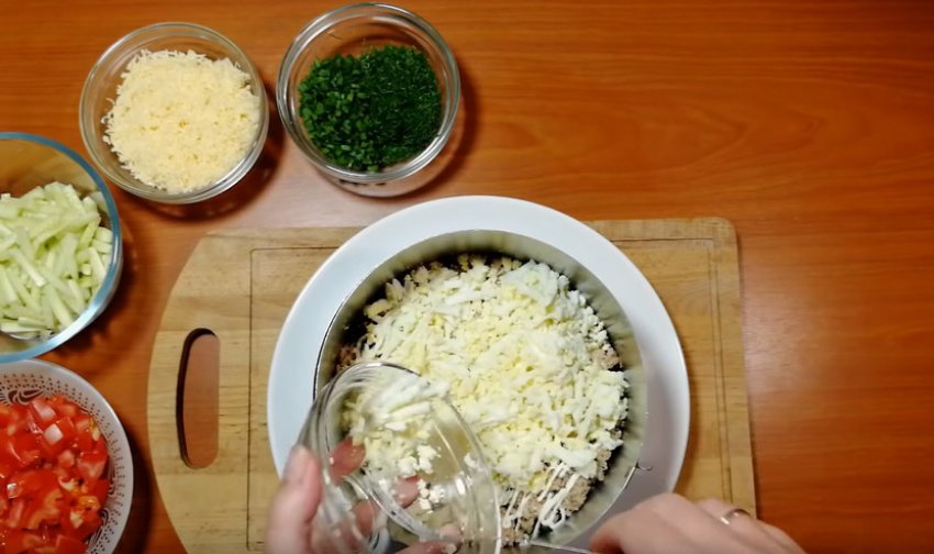 Укладіть далі шари в послідовності: огірок, помідор, цибуля з кропом, твердий сир; кожен шар необхідно промащувати майонезом.![]()