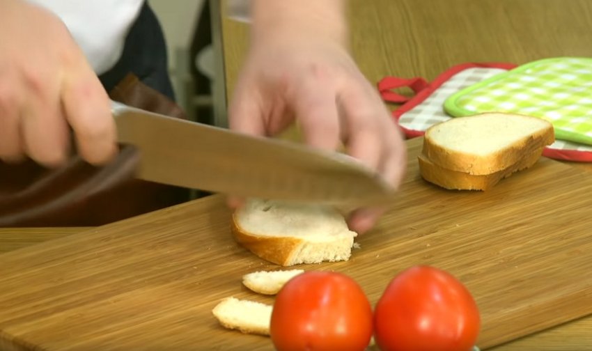 Приготуйте сухарики: зріжте окраєць із хліба, щоб готовий продукт був більш естетичним і ніжним, наріжте кубиком, розміром 2 на 2 см. Обсмажте на розігрітій пательні без використання рослинної олії, до легкої золотистої скоринки.![]()