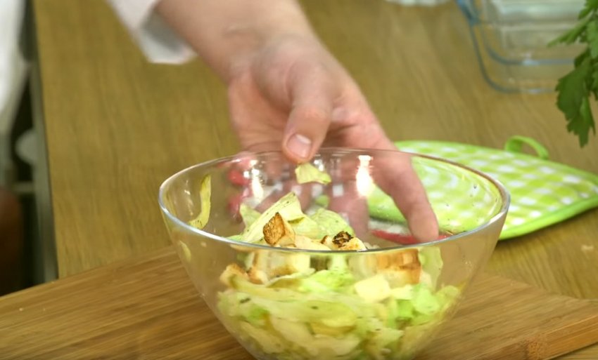 Підсушені сухарики додайте в миску, пересипте салат у велике блюдо гіркою і приступайте до заключного етапу приготування.![]()