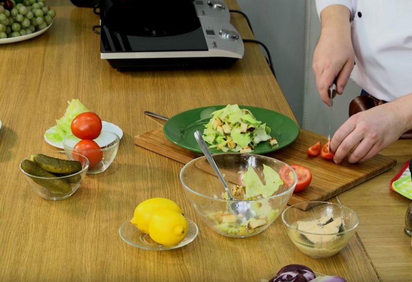 Помідор помийте, посушіть і наріжте невеликими часточками, розмістіть хаотично поверх гірки.![]()