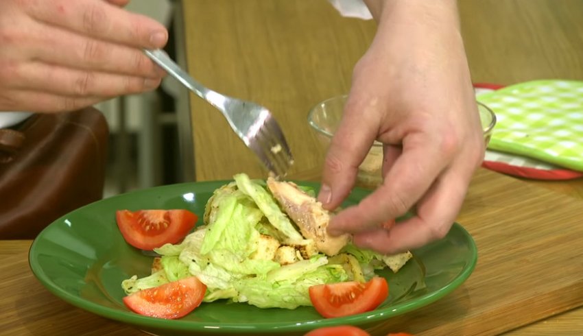 Викладати салат краще на велику неглибоку тарілку, помістивши листи салату під низ готової страви для прикраси.![]()