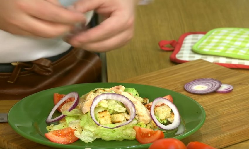 Наріжте очищену цибулю півкільцями і прикрасьте ними салат.![]()