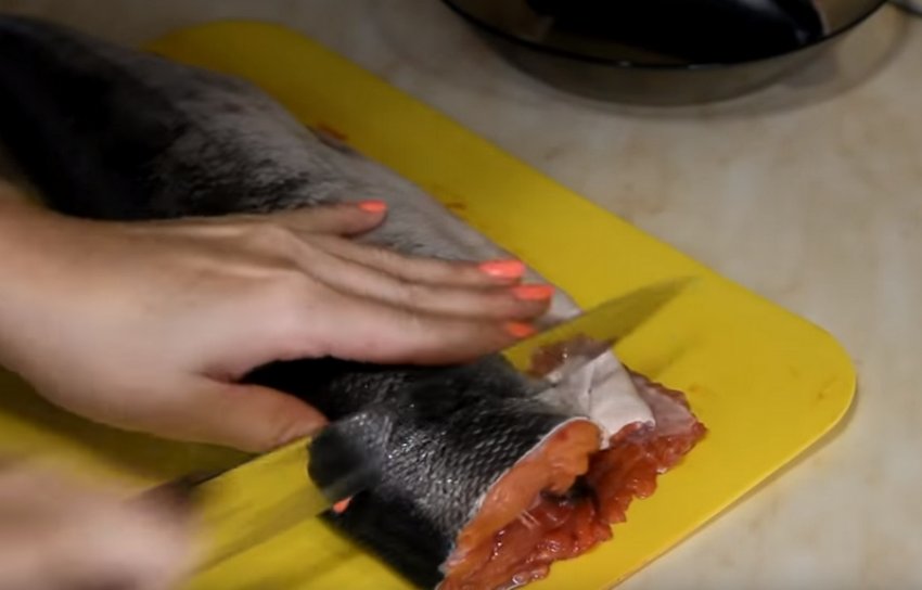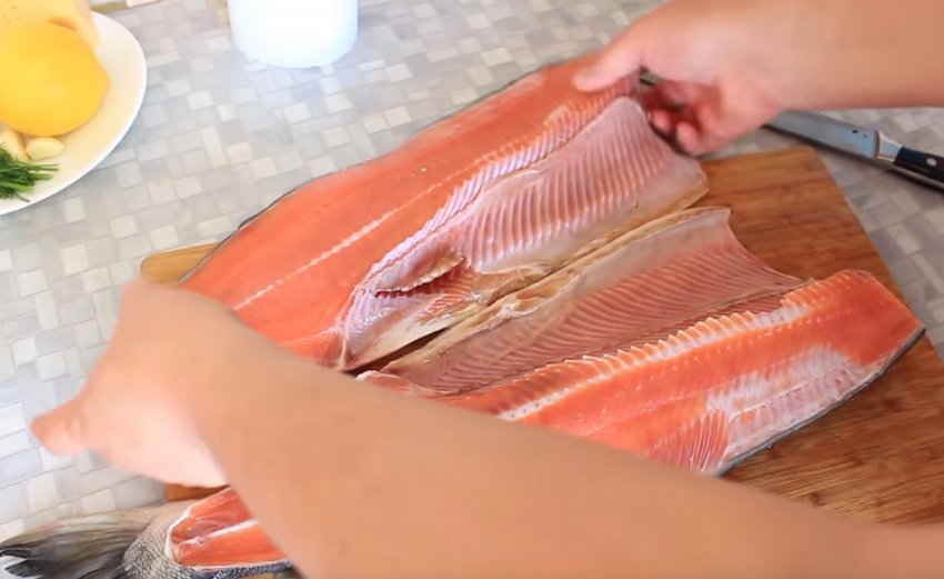 ножем уздовж хребта, зрізати спочатку одне, а потім друге філе. З них видалити плавники, кістки. Для відділення філе від кісток використовуйте загострений ніж.![]()