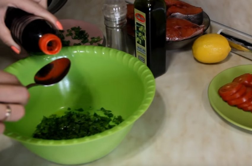 нарубати зелень, змішати з олією та соєвим соусом. Стейки помістити в ємність із маринадом і акуратно перемішати, щоб риба повністю ним покрилася.![]()