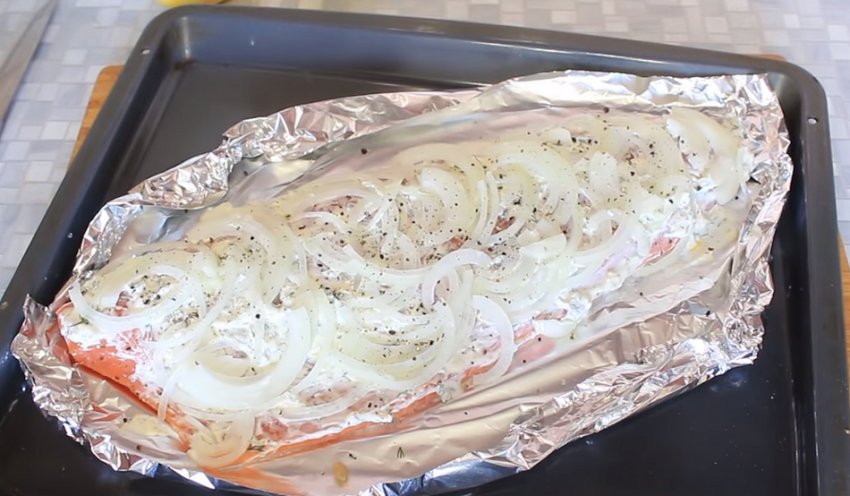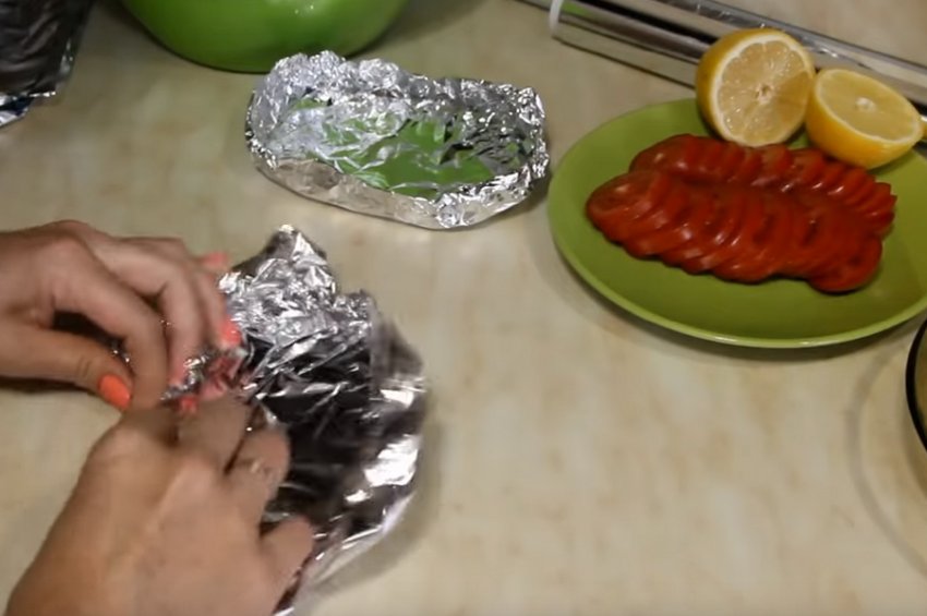 харчової фольги зігнути свого роду судочки розміром трохи більшим за стейки. Борти по висоті мають бути трохи вищими за поміщений всередину шматочок риби.![]()