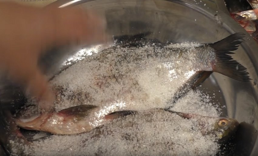 Тушку гарненько посолити зовні і витримати близько 8 годин (якщо 1 риба важить до 1 кг).![]()