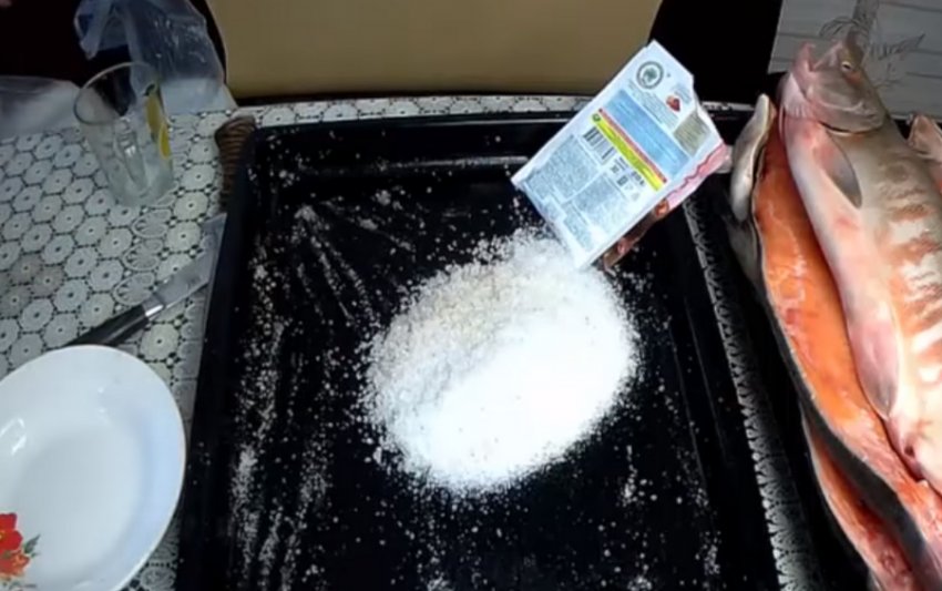 сіль і спеції, що залишилися на поверхні тушки, за допомогою ложки. Залишити рибу в такому вигляді ще на 10-12 годин, щоб вона підсохла.![]()