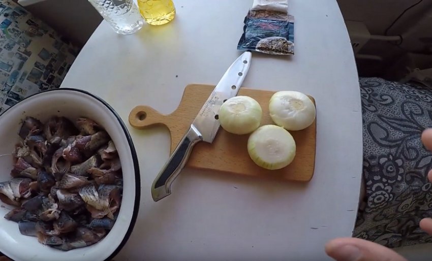 Підготовлені тушки розріжте на шматки однакового розміру. Половину об'єму очищеної цибулі нашаткуйте півкільцями, злегка розімніть, розділяючи на смужки, щоб вона пустила сік.![]()