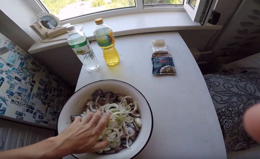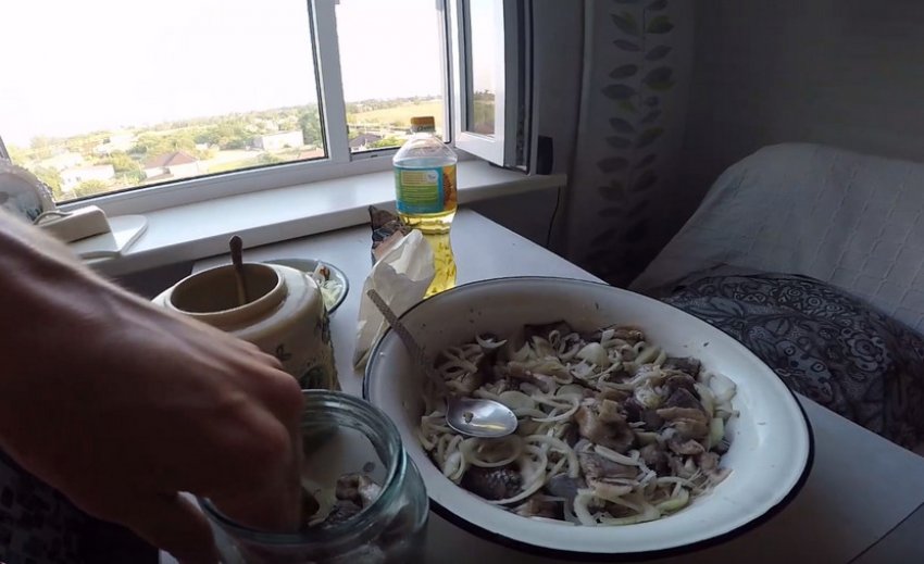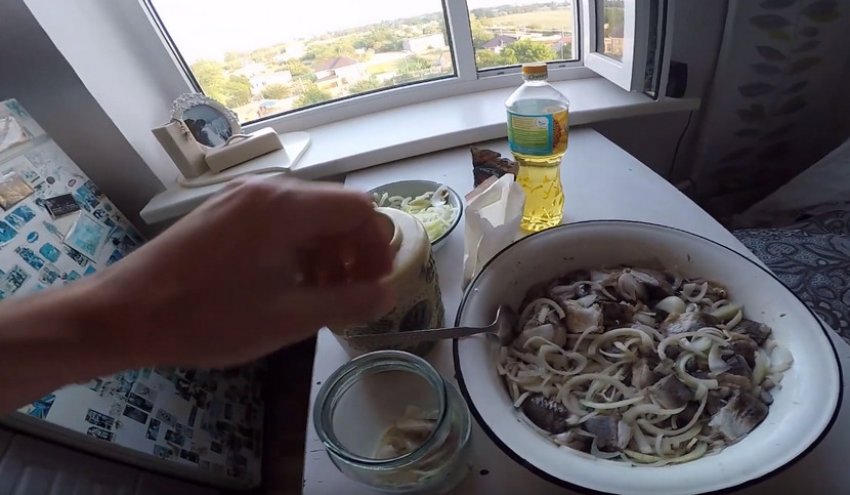 Повторюйте шар за шаром, по черзі наповнюючи посуд спеціями з сіллю, сумішшю цибулі, потім рибкою до самої шийки. Верхнім інгредієнтом має стати маринована цибуля.![]()