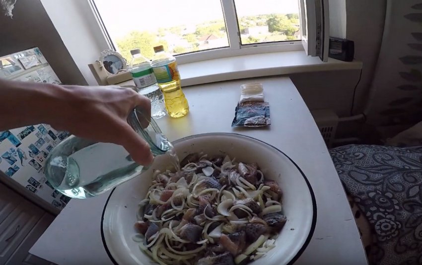 Заливайте цим розчином карася з цибулею так, щоб рідина рівномірно покривала верхній шар риби, який необхідно злегка розрівняти, придавлюючи рукою. Додайте за необхідності оцет, змішавши його з водою в пропорції 5:1.![]()