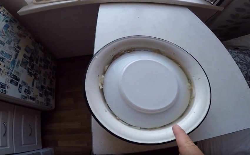 Накрийте ємність із маринадом і шматками карася плоскою тарілкою і притисніть зверху гнітом, щоб риба повністю занурилася в оцтовий розчин. Як обважнювач може виступити літрова банка, наповнена водою.![]()