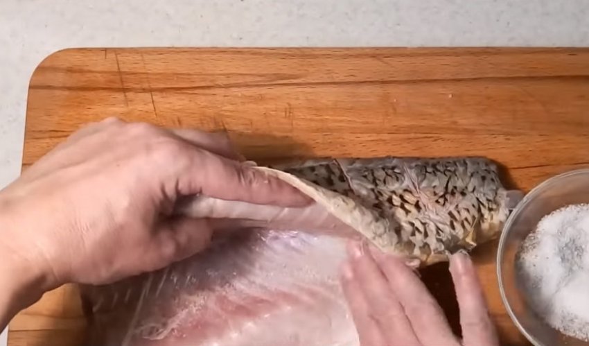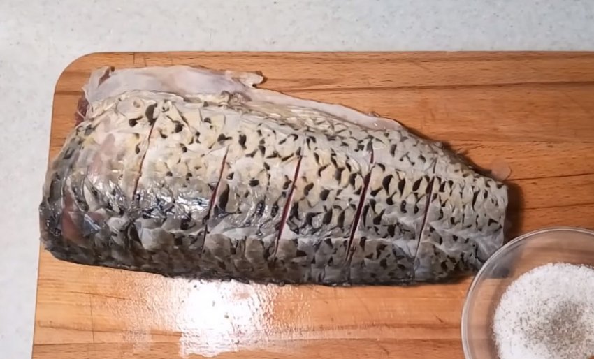 З тушки видалити луску, нутрощі, голову і всі плавники. На боках, через кожні 3-4 см, провести ножем поперечні смуги. Скільки їх робити, залежить від величини риби, після приготування за ними ви будете ділити страву на порції.![]()