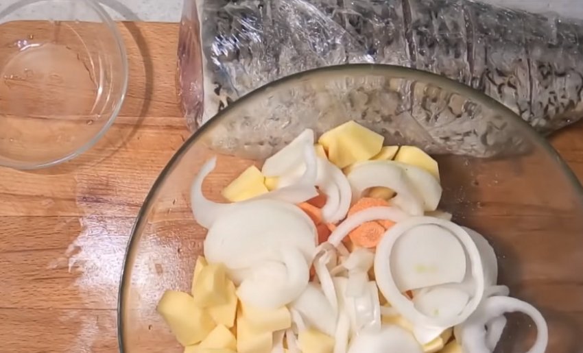 Поки риба маринується, наріжте овочі: морквину, цибулю - кільцями, картоплю - кубиками, все змішати і посолити.![]()
