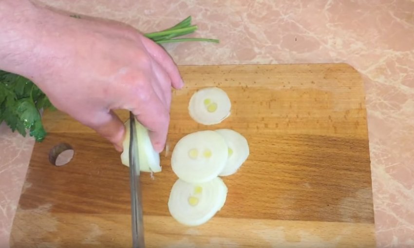 - Тим часом нарізати цибулю кільцями і змішати її з майонезом. Видавити сік половини лимона і додати туди ж, перемішати.
