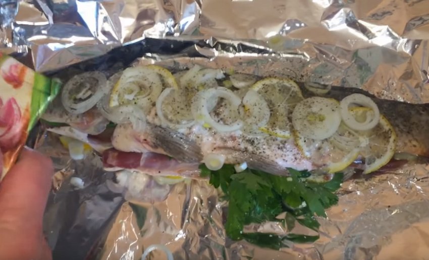 Помістити сазана на цибулево-лимонну подушку, зверху зробити таку саму. Загорнути фольгу, підігнути краї. Намагайтеся зробити це таким чином, щоб не залишалося щілин, звідки може витекти рибний бульйон.![]()