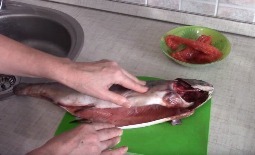 Горбушу почистити, помити під проточною водою, обов'язково слід видалити плавники і голову.![]()