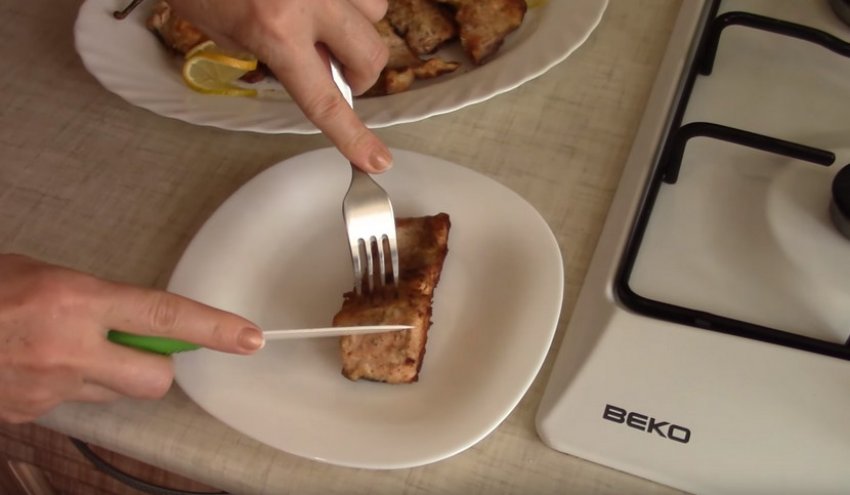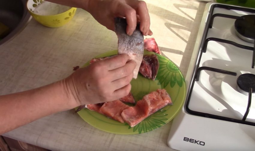 Рибу почистити, промити під проточною водою. Голову та плавники слід видалити. Порізати на порційні шматки поперек хребта. Товщина м'якоті - близько 2 см.![]()