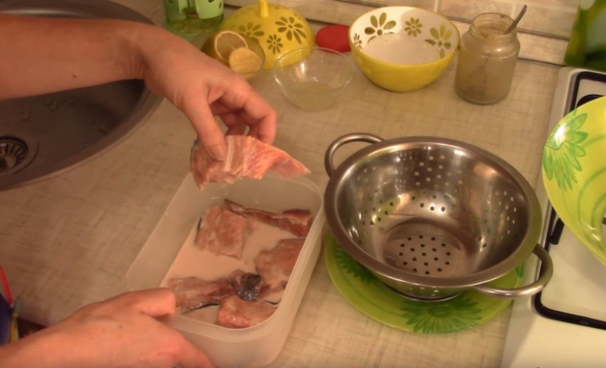 Залити стейки молоком і поставити на 8-10 годин у холодильник. Викласти рибні скибки в друшляк і почекати, коли рідина стече.![]()