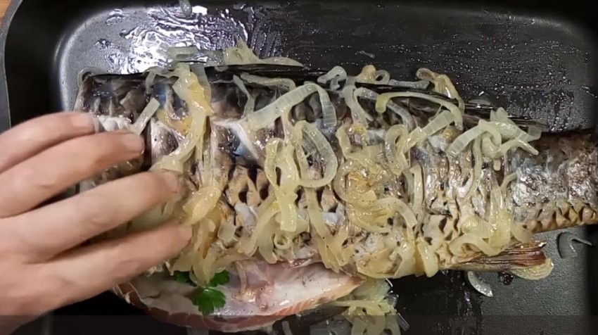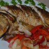 рибу на деко. Додайте обсмажену цибулю в розрізи і всередину рибної тушки.![]()