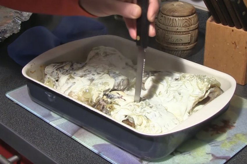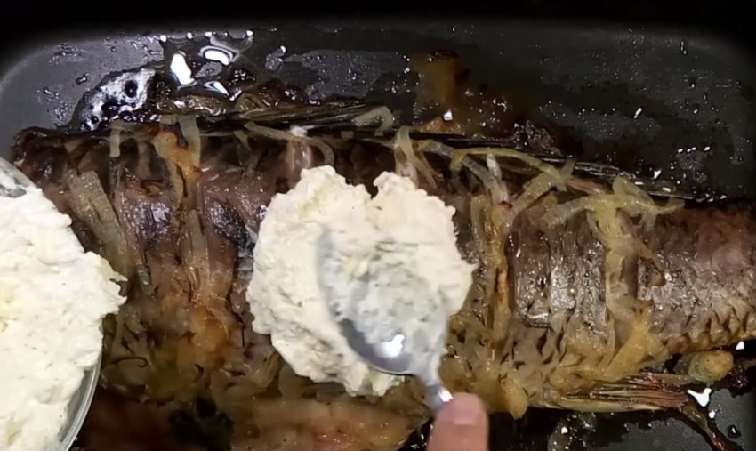 зазначений час дістаньте сазана, полийте його сметанним соусом і посипте сиром. Відправте в духовку ще на 10 хвилин.![]()