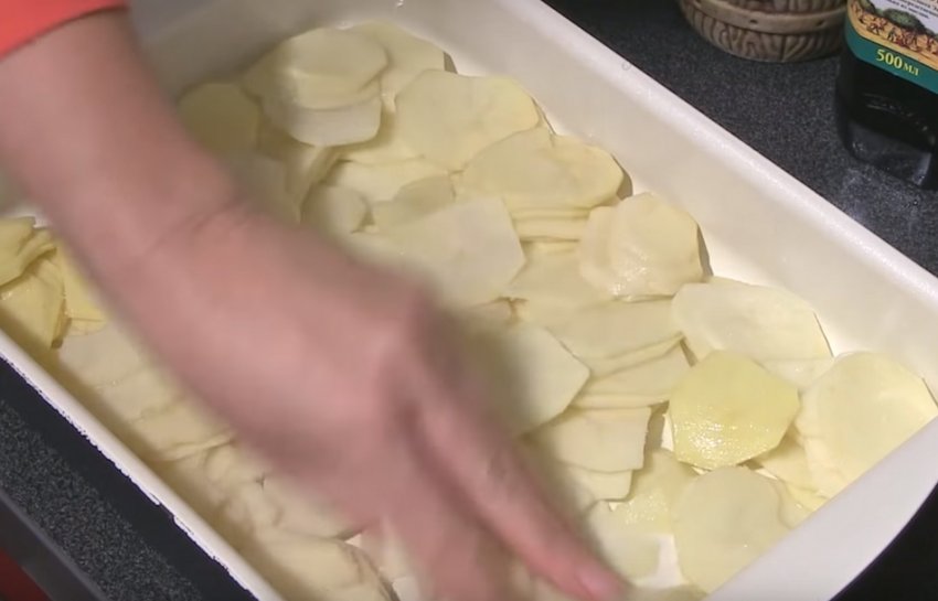 картоплю і подрібніть скибочками. Викладіть її на деко, закриваючи дно.![]()