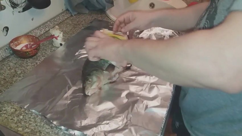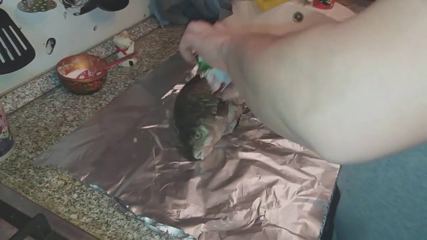 Перекласти рибу приправленим боком на фольгу і повторити процедуру, обробивши другий бочок.![]()