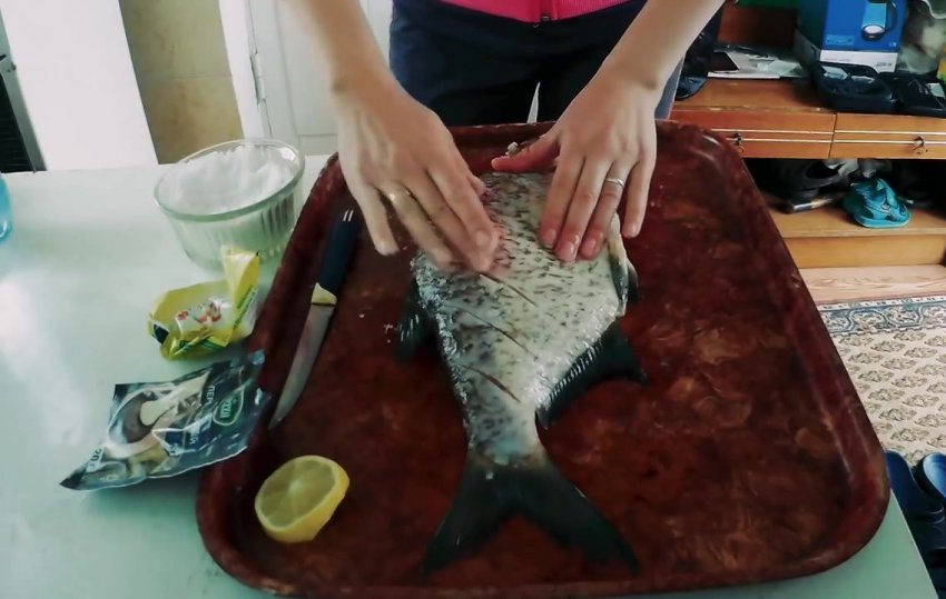 Надрізи на рибі скропити свіжовичавленим соком лимона, акуратно розсовуючи м'ясо.