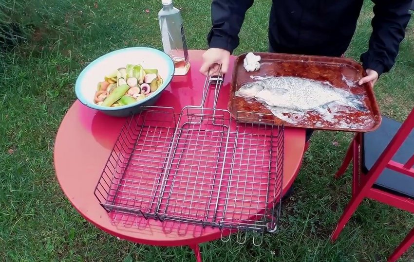 Рибу викласти на решітку і відправити на мангал. Зверху бажано накрити металевою кришкою, щоб страва добре просмажилася всередині.![]()