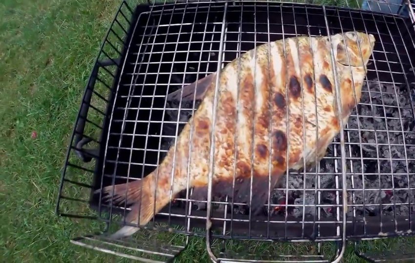 Змащену олією рибу викладають на решітку, смажать 30-40 хвилин, час від часу перевертаючи. Окремо можна підсмажити півкільцями цибулю, помідори і прикрасити рибну страву, розклавши овочі по краях. Вдалим довершенням буде присипка зі свіжої зелені.