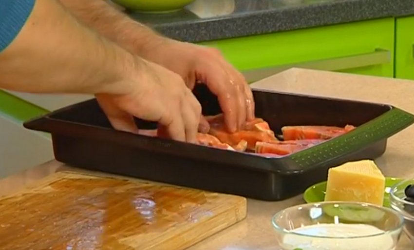 Очистити стейки від шкури та викласти у форму для запікання. Сир натерти на дрібній тертці.![]()