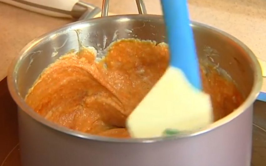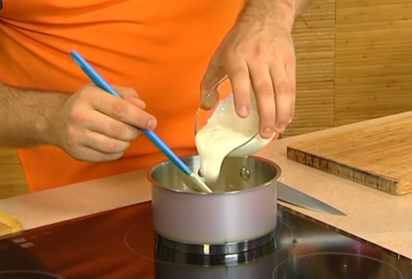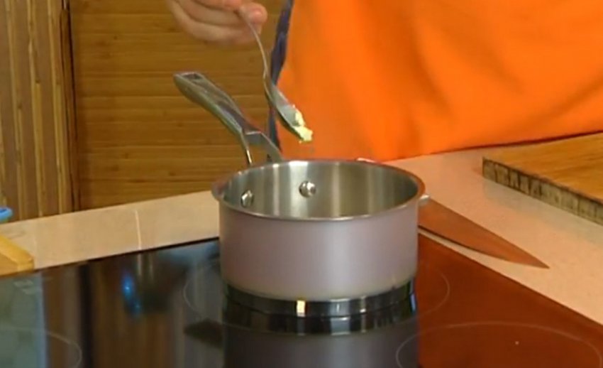 Розтопити в сотейнику вершкове масло. Коли воно розтопиться, додати ложку борошна, підрум'янити його до коричневого кольору, помішуючи.![]()